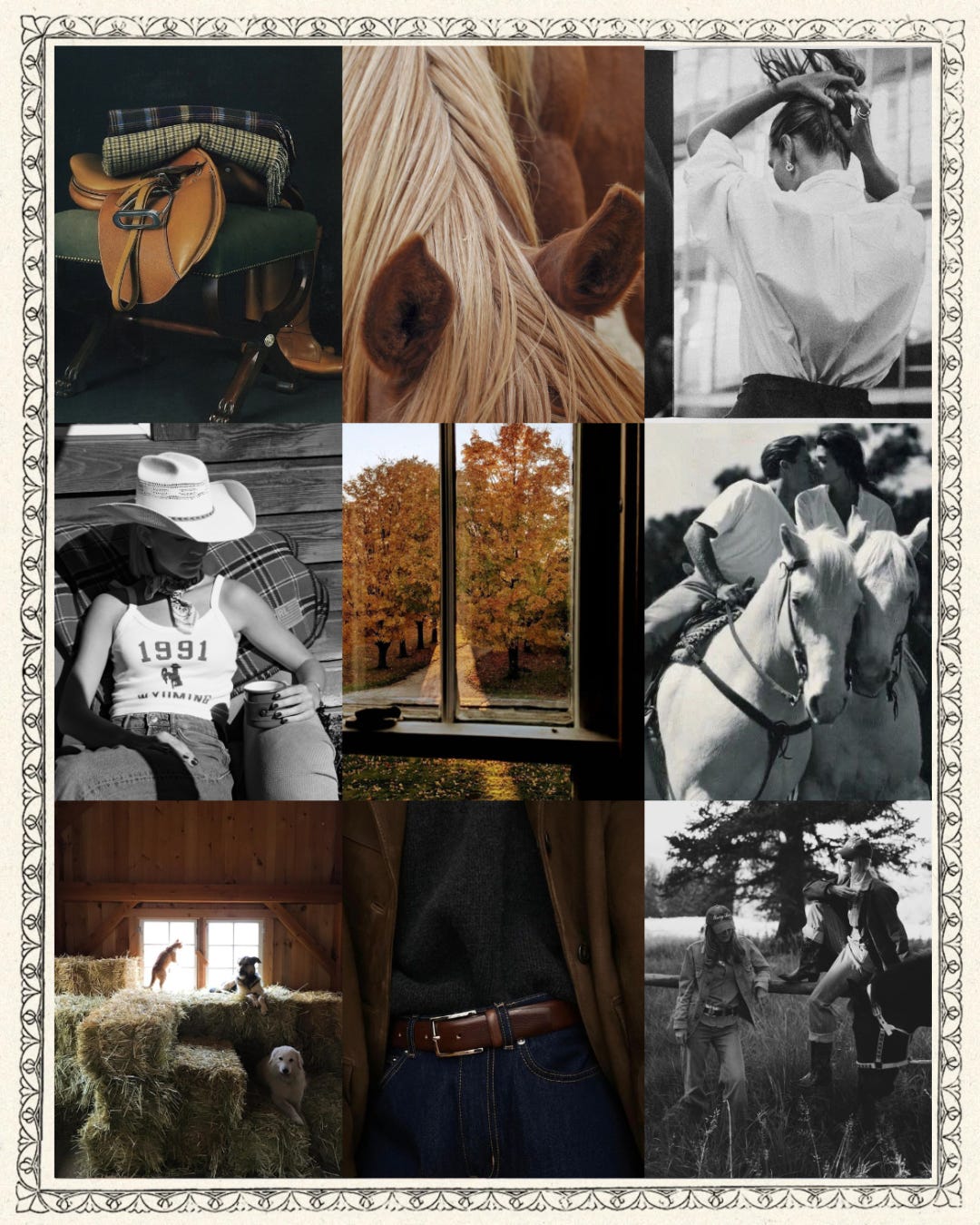 This month’s mood drifts between the scent of leather and the crisp whisper of fall. It’s the season of slow mornings in the barn, golden trails framed by changing leaves, and the warmth of a wool blanket after a ride. Our October mood board captures the refined ruggedness of Western life — timeless denim, polished saddles, the gentle bond between horse and rider. It’s a nod to classic Americana with a modern, feminine spirit — grounded, effortless, and nostalgic in all the right ways.